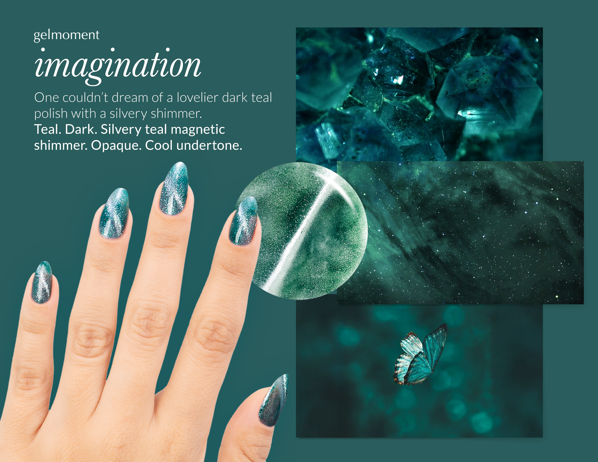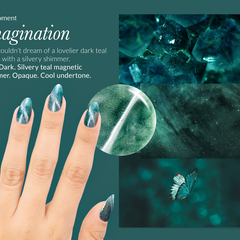 Teal. Dark. Silvery teal magnetic shimmer. Opaque. Cool undertone.